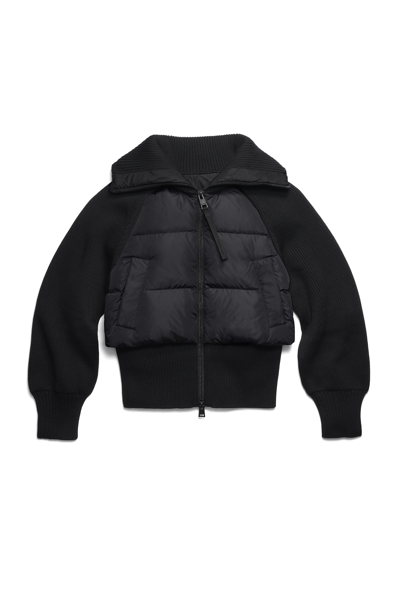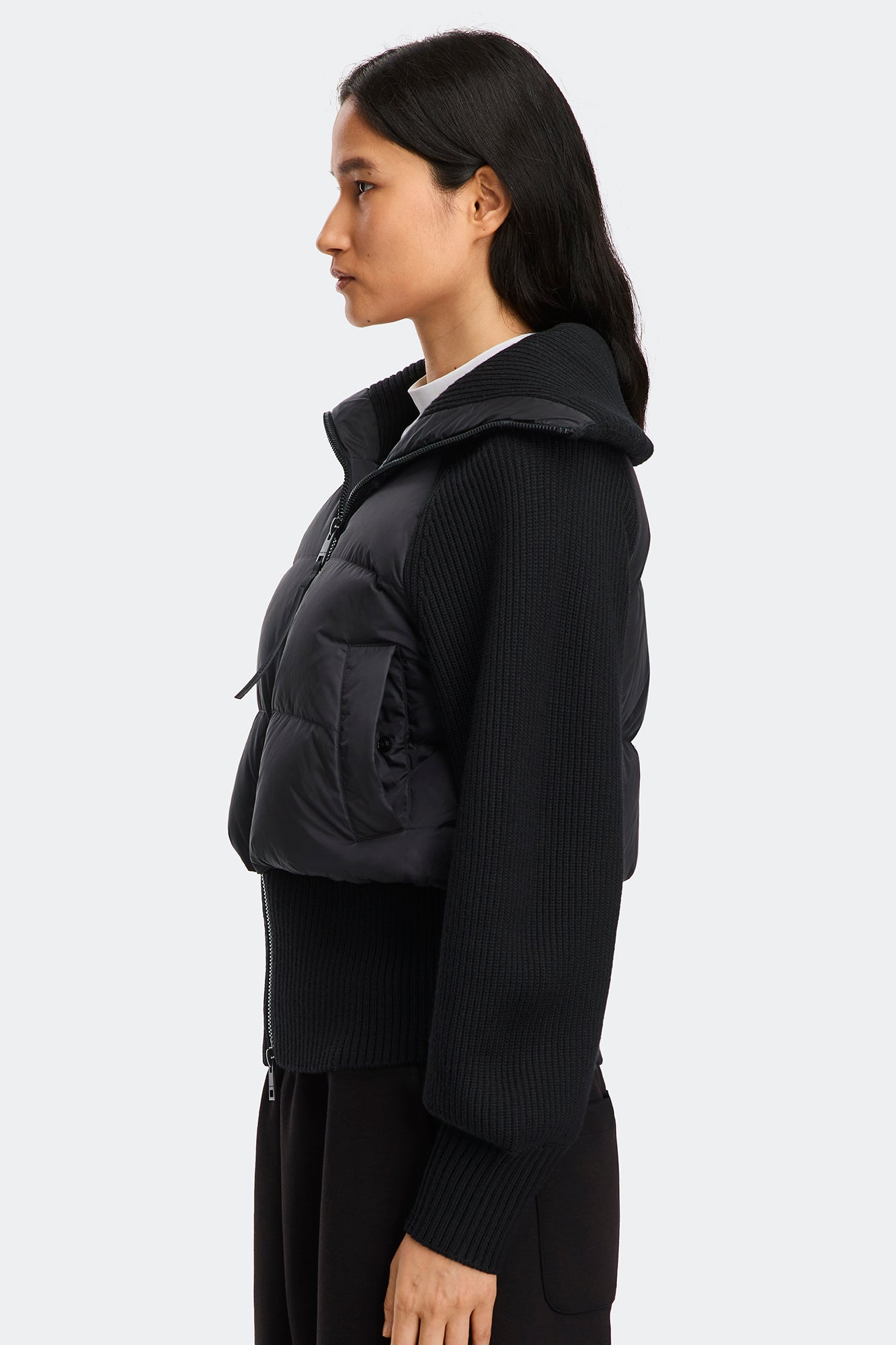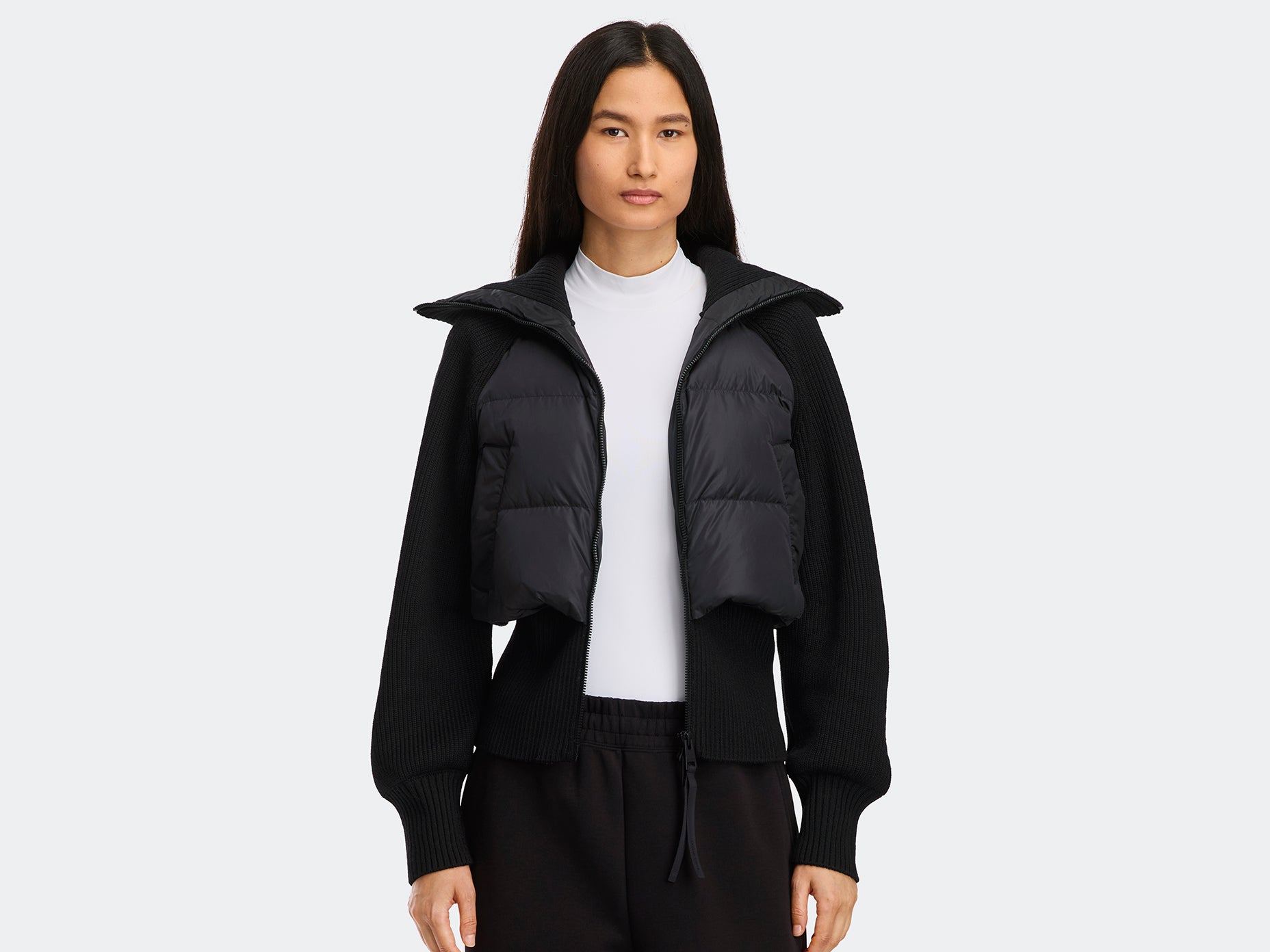 The HyBridge® Astoria Jacket is crafted from merino wool for exceptional softness and breathability. The down-filled panels feature Performance Nylon for essential warmth and a subtle sheen finish. This bold style features an elongated ribbed hem that frames the waist and ruching at the sleeves for added volume. This style uses a thicker knit and wider quilting than our other HyBridge® styles.